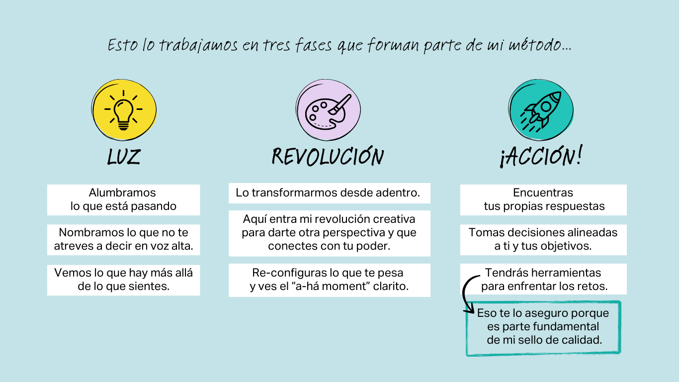 Este es el espacio donde acompaño a mujeres creativas a dejar de cargar con todo solas —emociones, desafíos, obstáculos, inquietudes — y a transformar eso que las abruma en energía creativa con claridad y ¡acción!.
